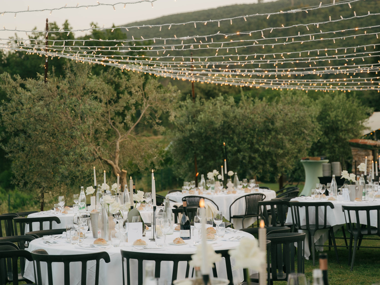 Rassemblez-vous autour sous un ciel étoilé, illuminé par des guirlandes scintillantes, pour un dîner mémorable.